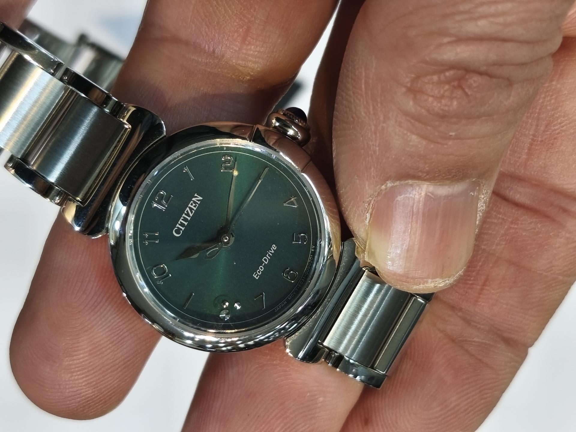Reloj Citizen EM1130-83X de la colección Lady con tecnología Eco-Drive, caja y brazalete de acero, esfera verde sostenible, cristal de zafiro y diseño fino de 26 mm. Elegante, ligero y femenino.