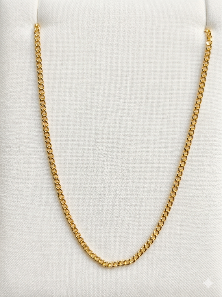 Cadena barbada de oro amarillo de 18 quilates, maciza, de 45 cm y 1,20 mm de grosor, con cierre reasa y peso aproximado de 2,70 gramos. Contrastada por el fabricante. Ideal para mujer como gargantilla fina y también para niña en comunión o bautizo. Apta para llevar sola o con colgantes pequeños.