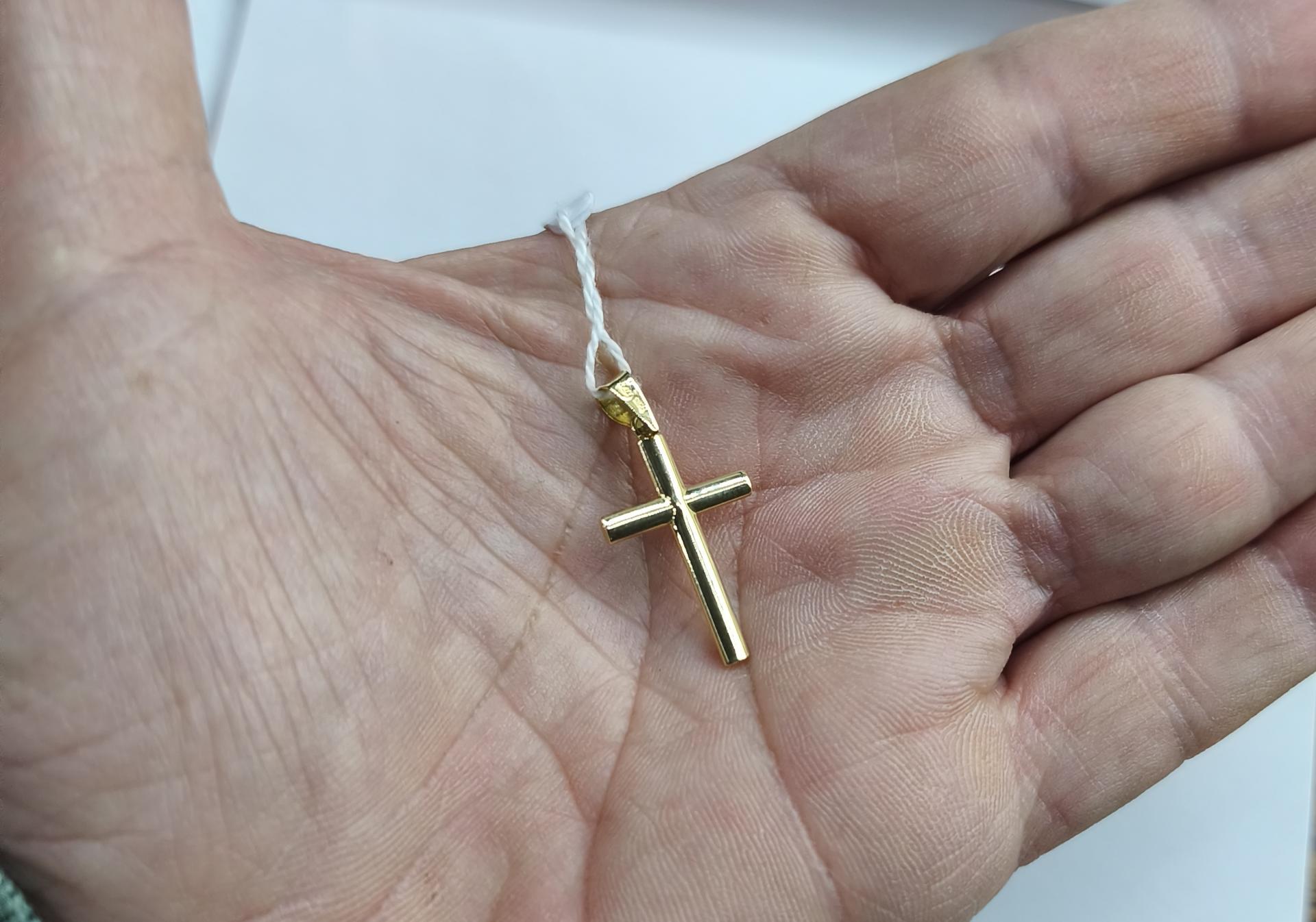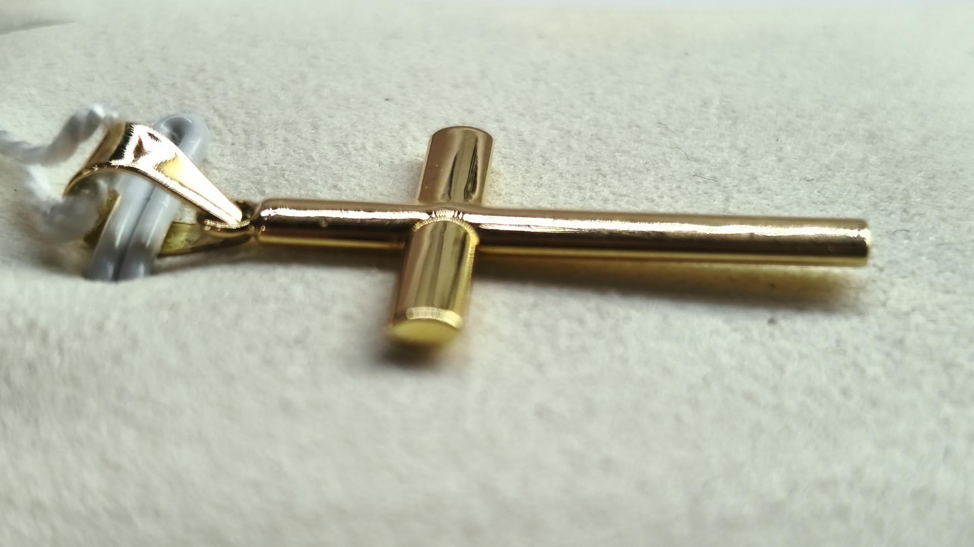Se trata de una cruz sin Cristo, de tamaño medio, adecuada para niño, niña, señora o hombre que prefiera una cruz fina, ligera y de líneas tradicionales. Está contrastada, un detalle importante que aporta confianza sobre la autenticidad del oro de 18 quilates.