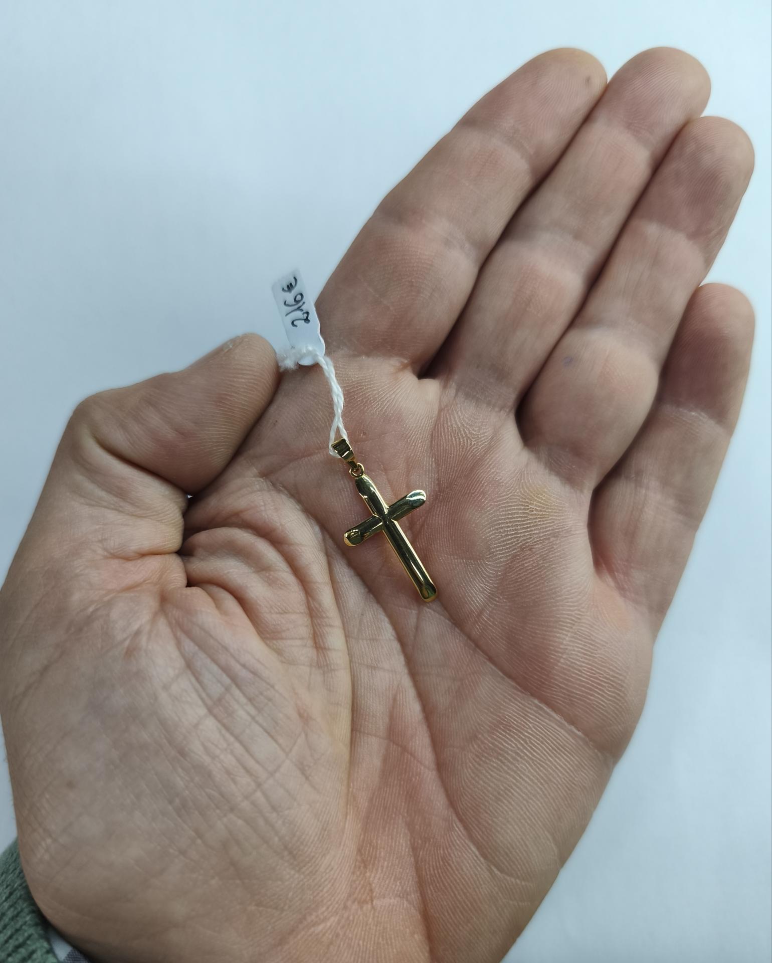 Cruz de oro de 18 quilates (750 milésimas) con frente curvado, parte trasera plana y cantos aplanados. Mide 30 mm de alto total, 15 mm de ancho, 1,80 mm de grosor y pesa 0,94 g. Tamaño medio-pequeño, ideal para niño o señora.