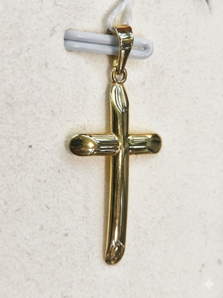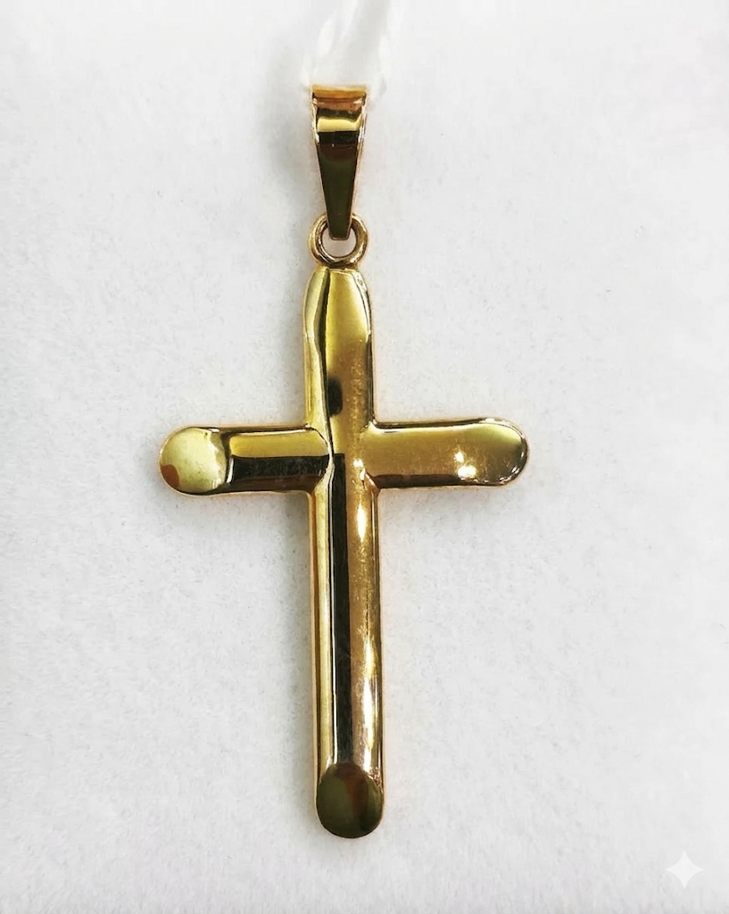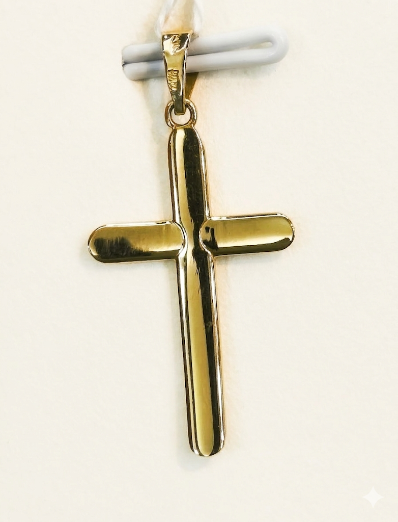 Colgante en forma de cruz fabricado en oro de 18 quilates (750 milésimas), con un diseño limpio, elegante y muy fácil de llevar a diario. Su acabado presenta la parte delantera curvada, lo que aporta un aspecto más suave y con mayor presencia visual, mientras que la parte posterior es plana para favorecer un apoyo más cómodo sobre la piel. Los cantos aplanados refuerzan su estética pulida y clásica, manteniendo una imagen discreta y actual.