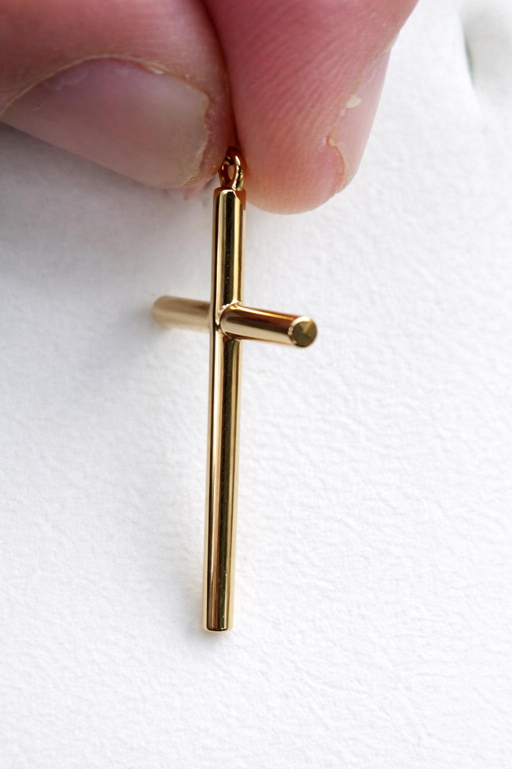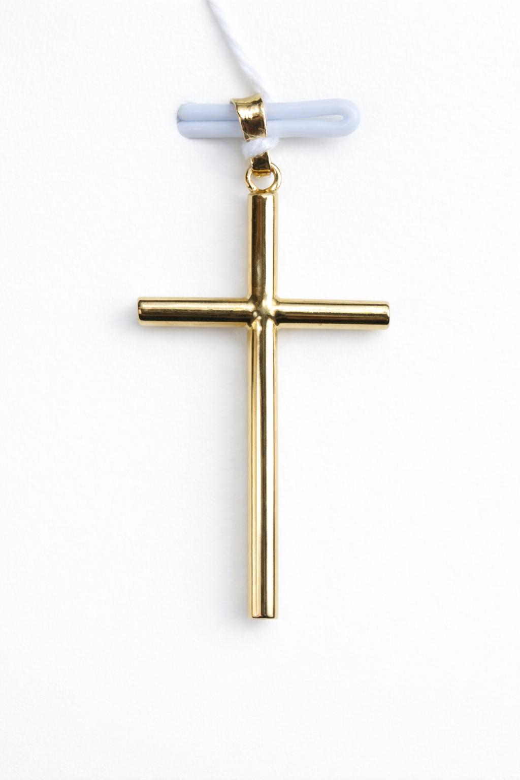 Esta cruz está elaborada en acabado brillo pulido, con presencia luminosa y estética cuidada por ambas caras, ya que es lisa en los dos lados. Su forma cilíndrica y sus líneas rectas refuerzan su estilo clásico, aportando una imagen sobria y equilibrada que favorece tanto a mujer como a hombre, además de poder adaptarse a diferentes edades.