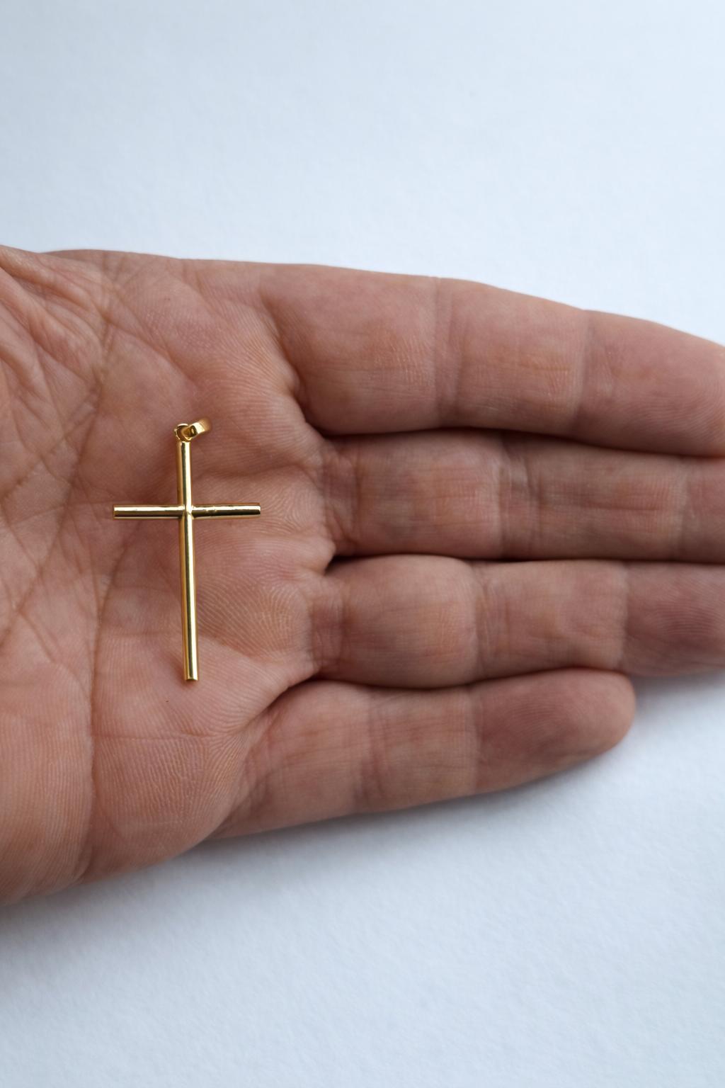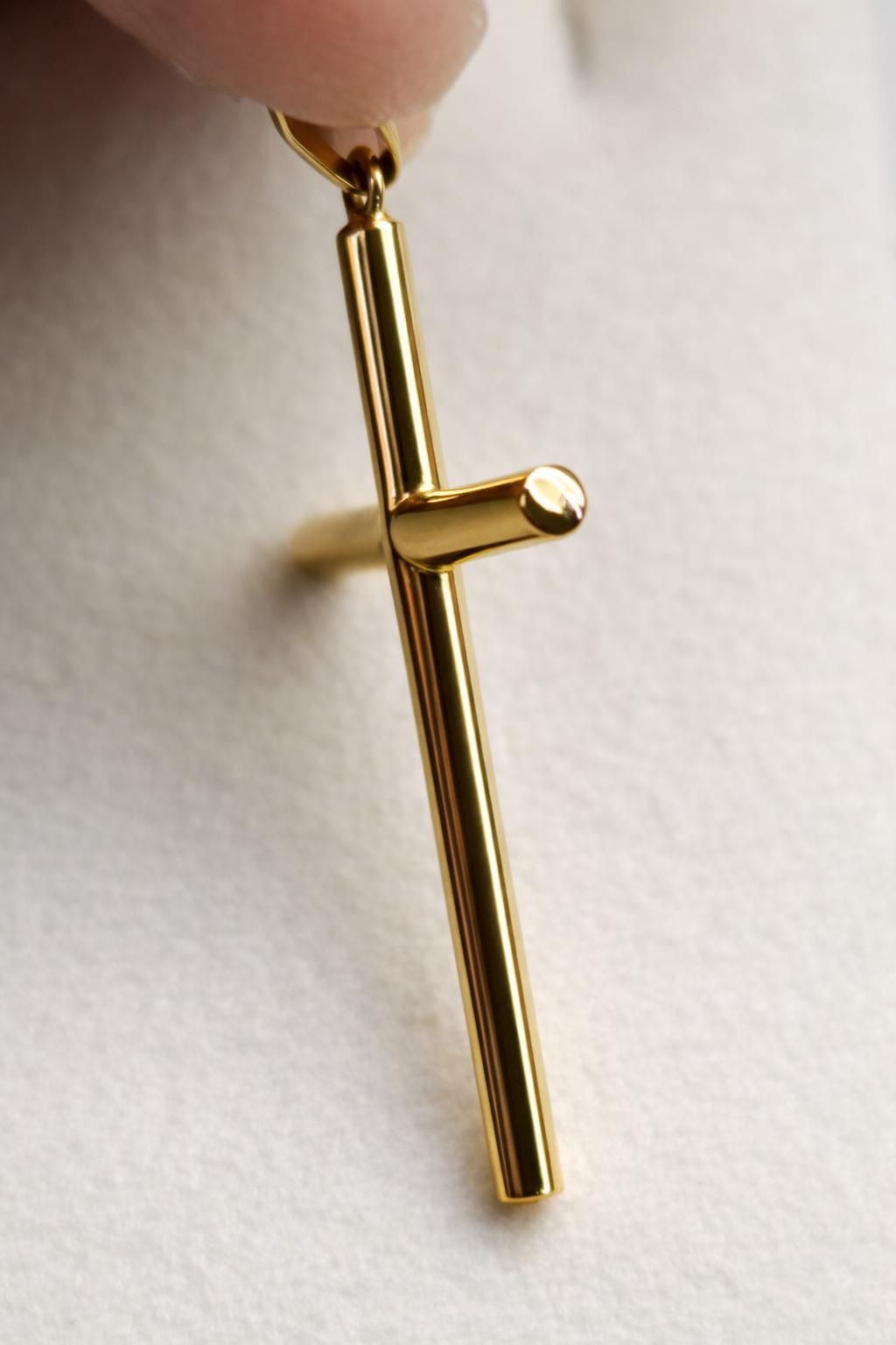 Cruz de oro de 18 quilates tubular de tamaño grande, ligera y elegante, con anilla triangular articulada. Diseño sin Cristo, contrastada y cómoda para uso diario.