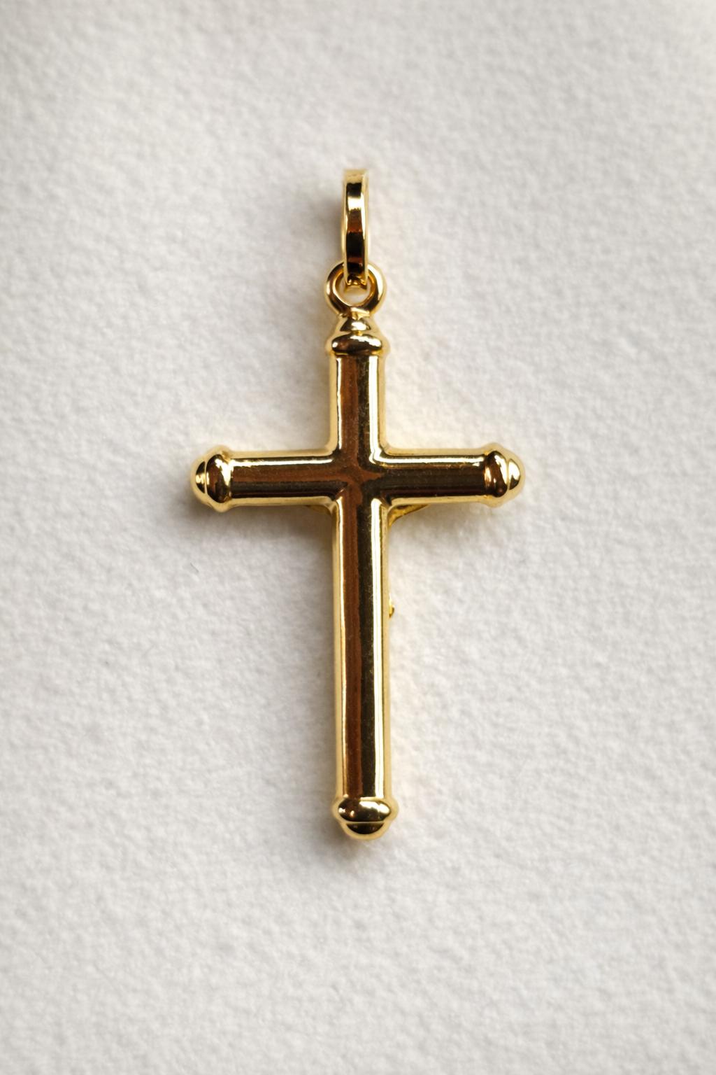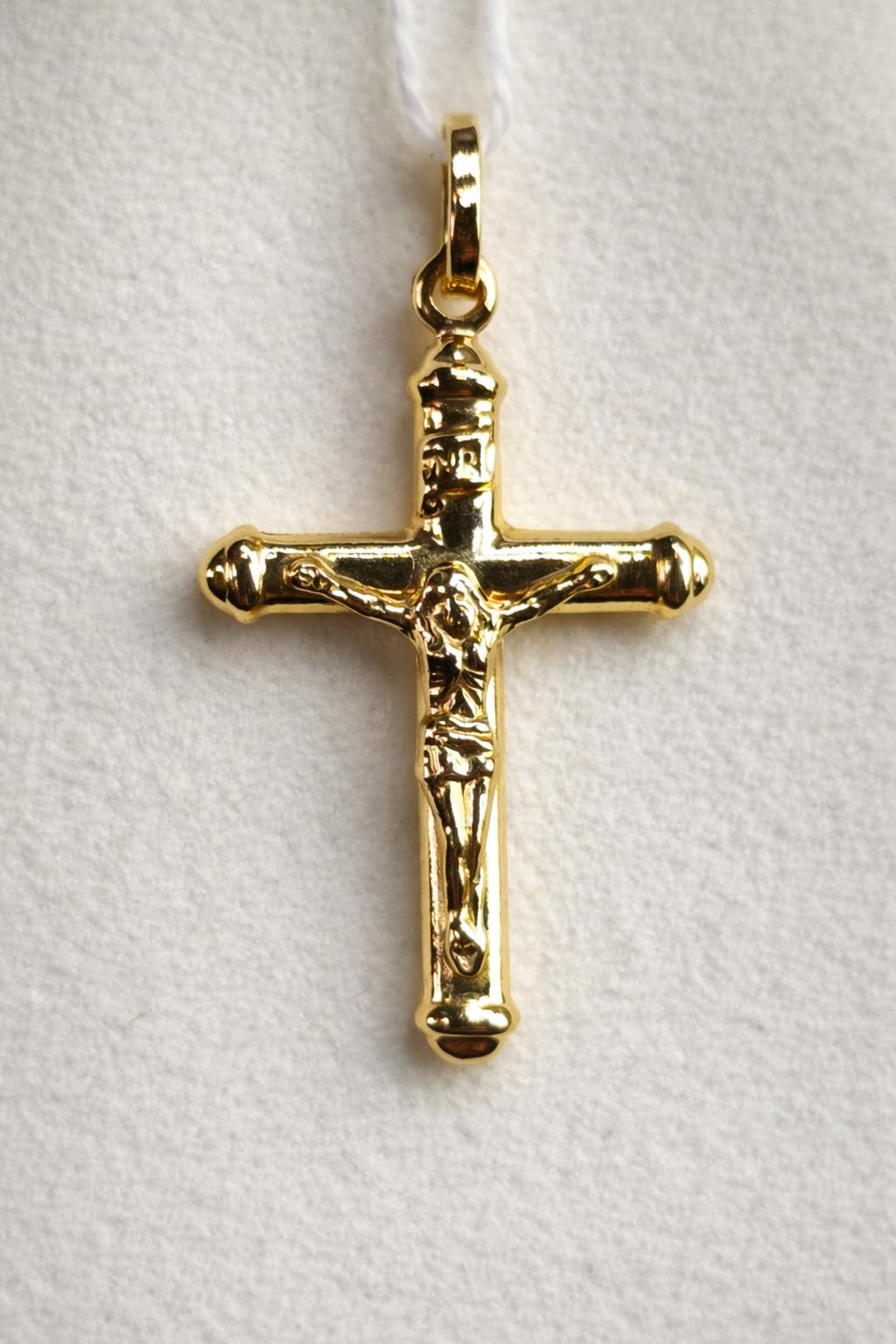 Cruz de oro amarillo 18 quilates pequeña tubular ovalada con Cristo 27 mm brillo